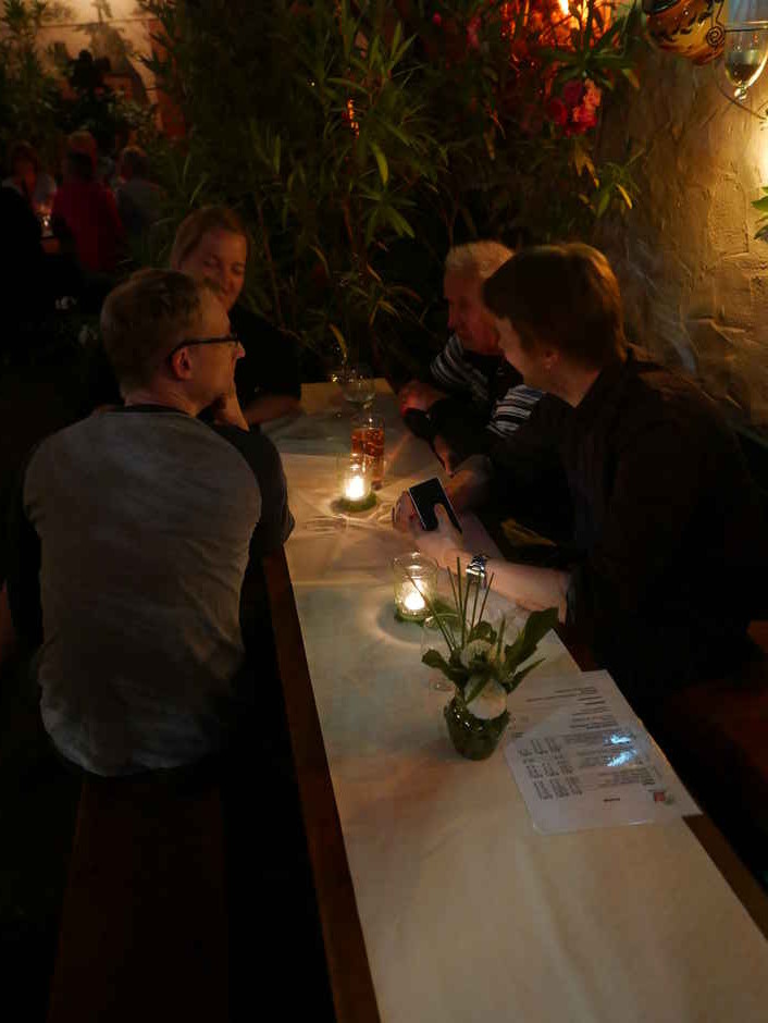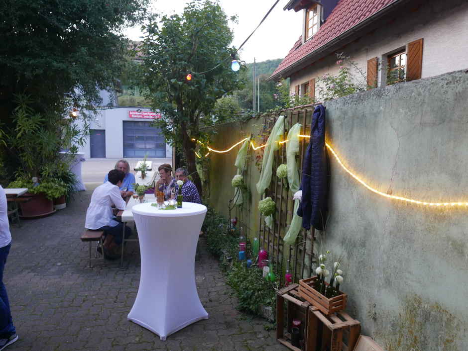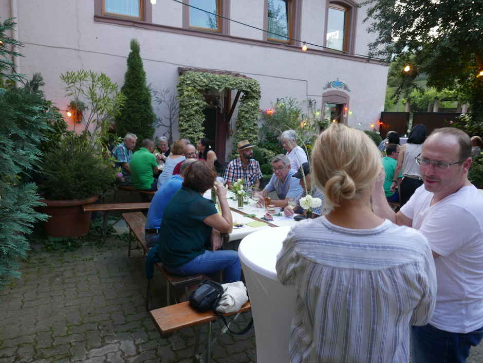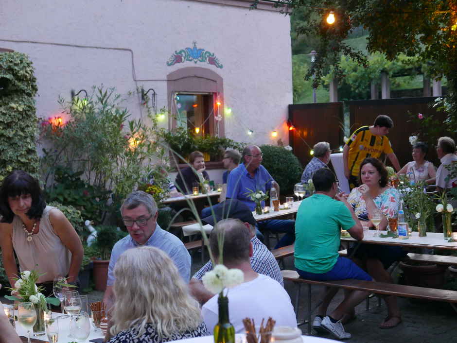 Zum dritten Mal schon fand der sommerliche Weinabend im gemütlichen Innenhof von Familie Moster in der Hauptstraße 51 statt. Leider etwas weniger gut besucht als in den beiden Jahren zuvor. Nichtsdestotrotz bescherten die angenehm milden Temperaturen und das trockene Wetter den Gästen um Gerlindes Hofbaum herum einen wunderschönen Abend.