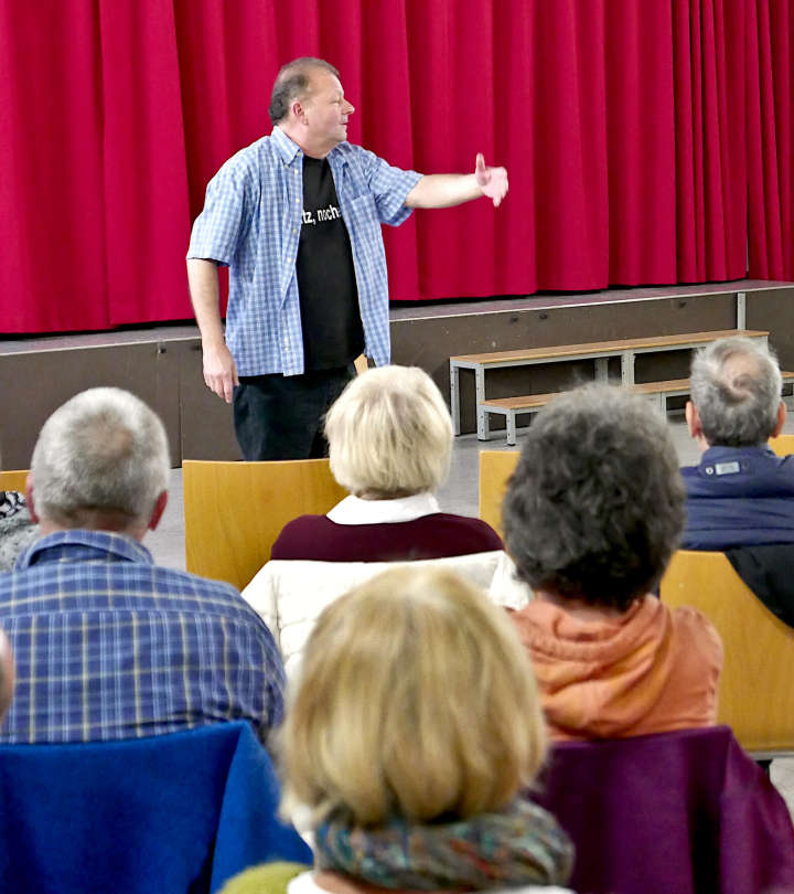 Auch in Silz hat Gerd Kannegieser treue Fans. Am 5. November konnten sie den Kabarettisten aus Kaiserslautern endlich wieder treffen, diesmal in der Aula des Kinderdorfs. Von der Örtlichkeit waren die Gäste recht angetan: „Schön warm hier“, fiel ihnen auf – in diesen Zeiten.