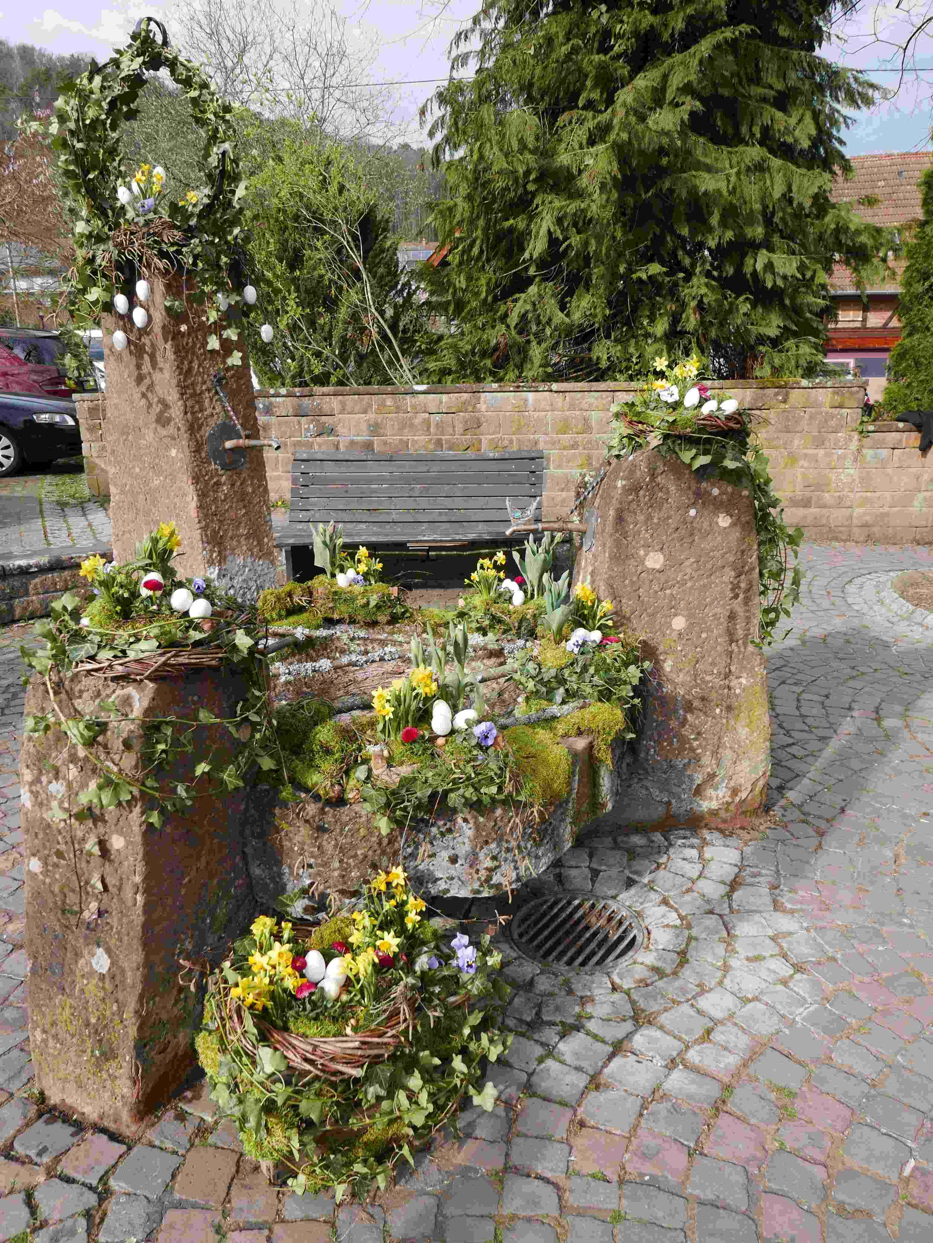 20 Grad und Sonnenschein – da macht es Spaß, den Osterbrunnen am Lindenplatz zu schmücken. Zwei Tage nach Frühlingsanfang traf sich eine Gruppe des Bürgervereins Silz, um den Brunnen aus seinem Winterschlaf zu wecken. Dazu mussten zuerst Zigarettenkippen, Kronkorken und Glasscherben aus dem Boden gekratzt werden. Dann kam der angenehme Teil des Projekts: Mit Osterglocken, Tausendschön, Tulpen und Stiefmütterchen schmückten die engagierten Dorfbewohner den alten Sandstein. Zwischen Weidengeflecht, Mooskugeln und trockenen Ästen arrangierten sie frisches Grün von Ginster, Birke und Heidelbeere. Schließlich setzten sie dem Brunnen die traditionelle schmiedeeiserne Krone. Zwischen Efeuranken legten sie in die Pflanzschalen dezent weiße Eier und Zwiebeln von Frühblühern.