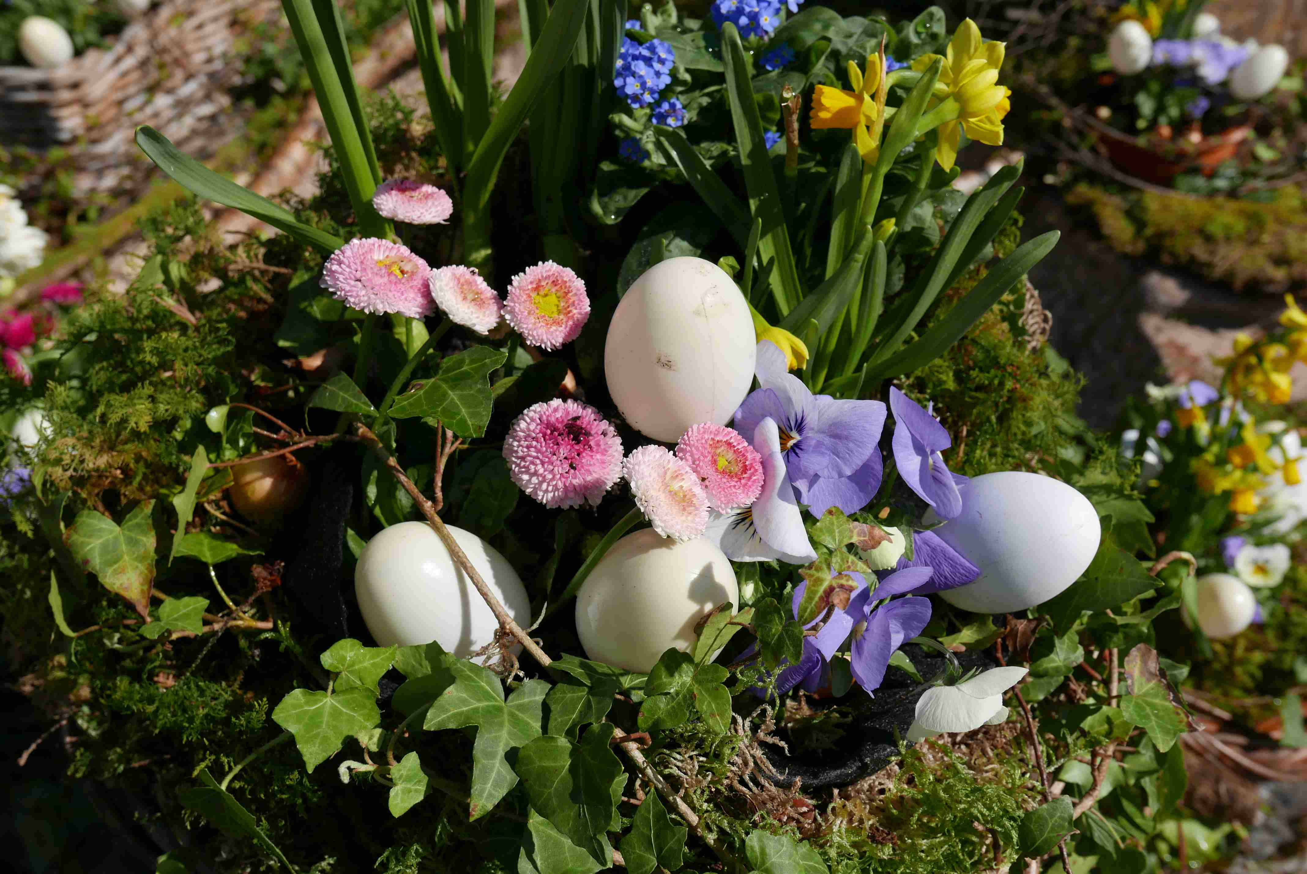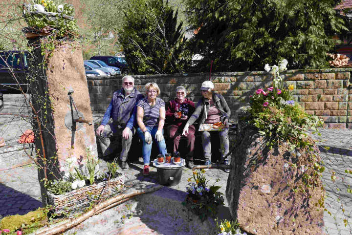 Ja, gebt’s denn des Johr kä Oschdrebrunne? Die Bäckereiverkäuferinnen, die sich selbst immer am geschmückten Lindenbrunnen erfreuen, gaben die Frage gern an die Macherinnen weiter. Und siehe da: Seit 9. April plätschert wieder Wasser inmitten der Frühblüher auf dem Brunnenrand. Rechtzeitig vor Palmsonntag.
