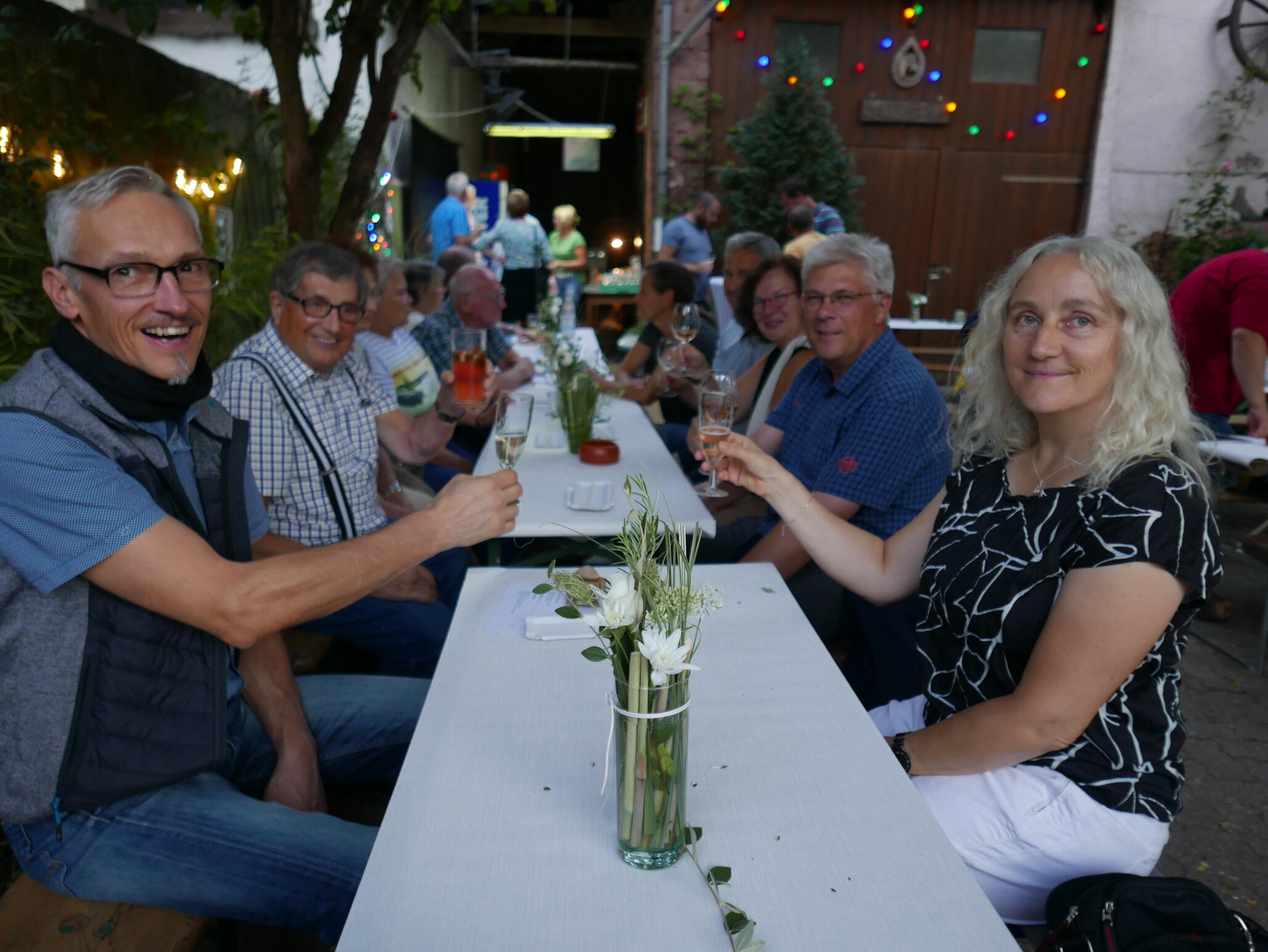 Wo wohnen Sie denn eigentlich? Das fragte ein erfahrener Rentner aus der Waldstraße eine Neu-Rentnerin aus der Gartenstraße. Auf dem Heimweg vom Weinabend am 20. August kamen sie am Päddel ganz ungezwungen ins Gespräch. Etwa gegen zehn verließen die ersten Besucher den herausgeputzten Hof von Gerlinde und Michael Moster in der Hauptstraße. Sie hatten einen sehr angenehmen Abend erlebt, Hausmannskost gegessen, verschiedene Weine probiert und viel gebabbelt.